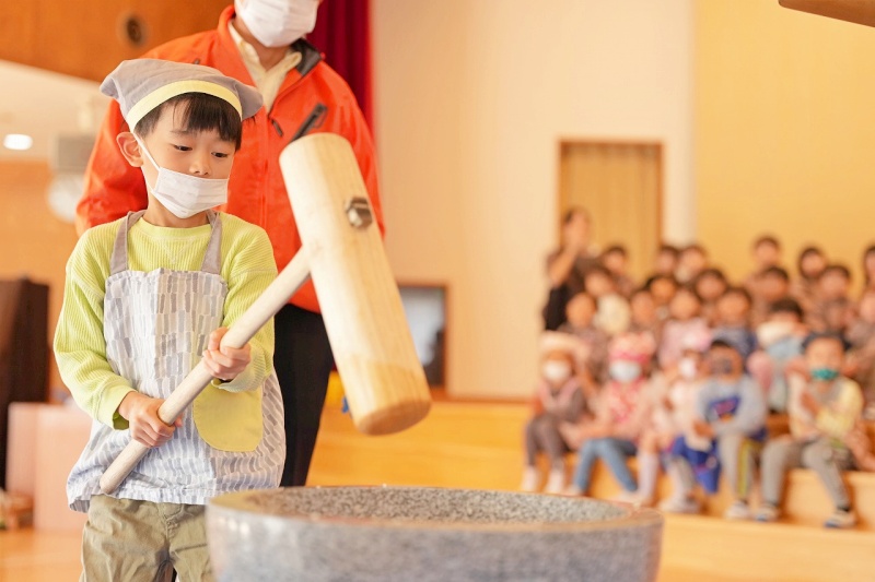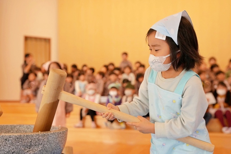 幼稚園で田植えをして稲刈りをした餅米でおもちつきをしました。